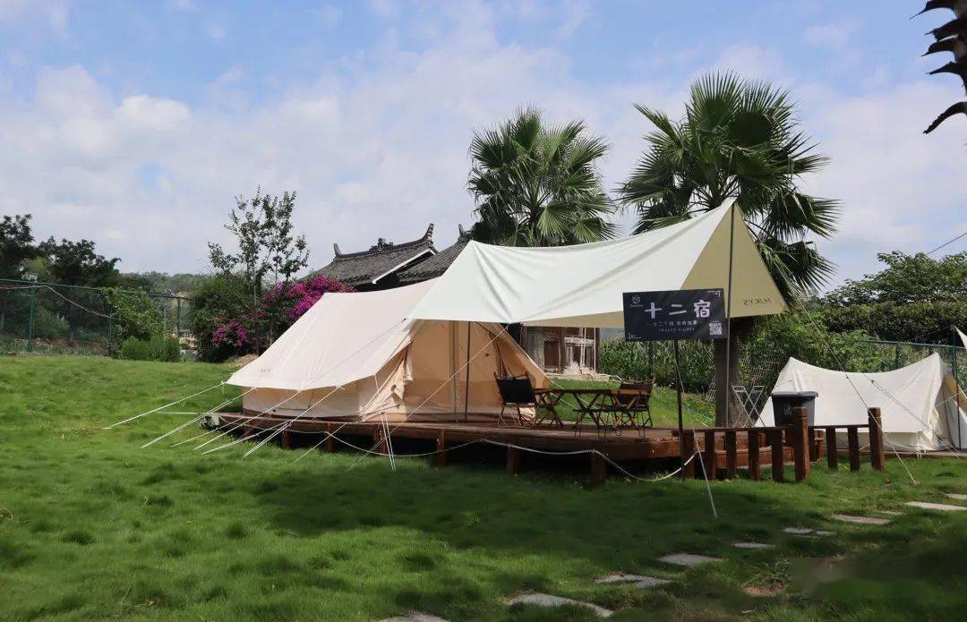 行走在营地,每一个帐篷前都有“壹半”“野萤”等不同主题的立牌,表演舞台前竖有“不甘平凡”的海报,这些字眼,年轻而时尚,沉浸在如此轻松愉悦的氛围中,让人不自觉地放空身心。营地里还配备了烧烤架、下午茶、集装箱、游泳池等设施设备,每一处都非常适合游客拍照打卡。