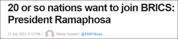 (观察者网讯)金砖国家领导人第十五次峰会计划于8月22日至24日在南非召开。据南非广播公司(SABC)7月17日报道,南非总统拉马福萨表示,金砖五国领导人将在峰会上讨论扩员问题,截至目前,已有约20个国家希望加入金砖国家组织。