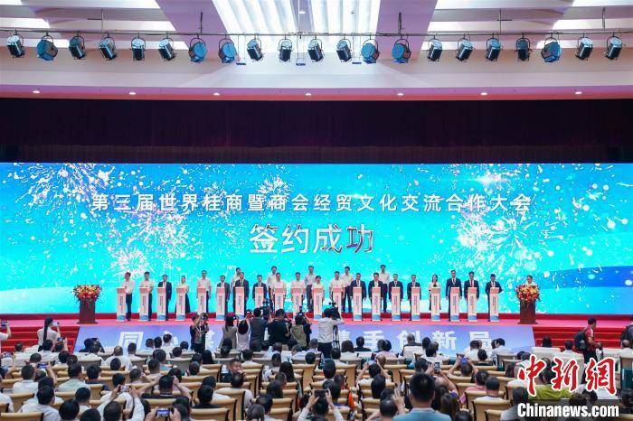 7月18日,第三届世界桂商暨商会经贸文化交流合作大会在广西南宁市召开。图为合作项目签约仪式现场。中新社记者 陈冠言 摄