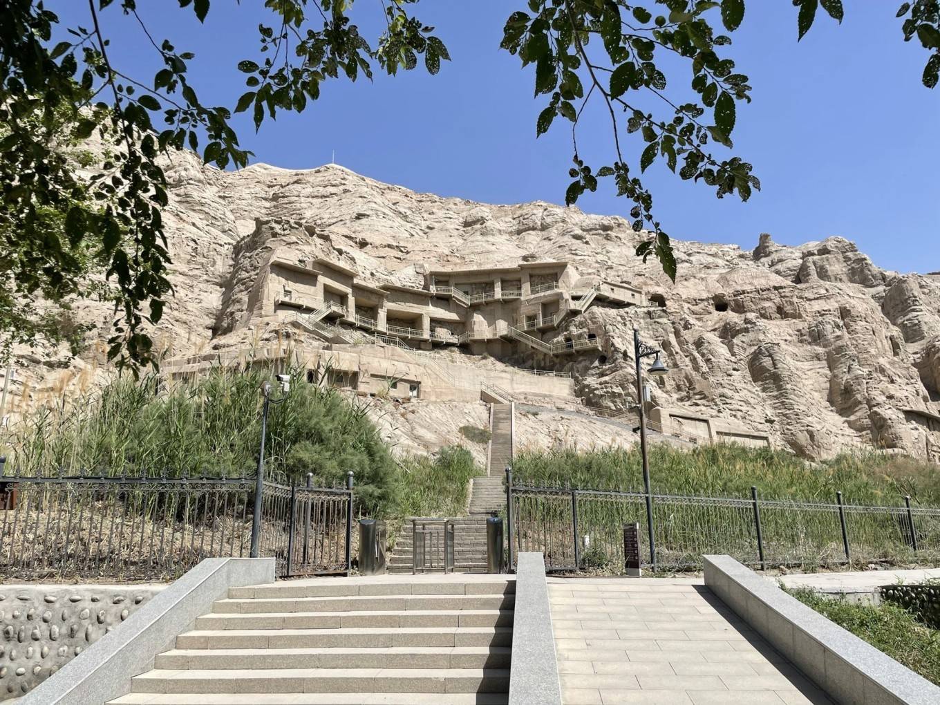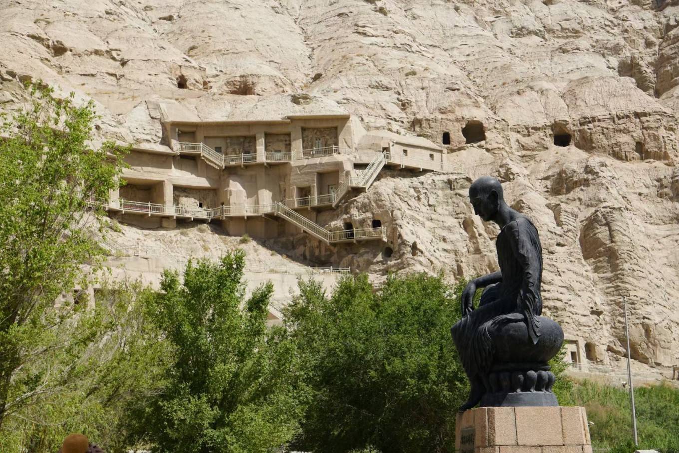 鸠摩罗什的雕像静静地矗立在石窟下方的入口处。这位有着 印度 血统的龟兹人,滞留凉州17年,58岁时被尊为国师引入长安,受命译经直至公元413年圆寂。一生共翻译了佛经294卷,至此汉传佛教大、小乘各派的经、律、论基本完备,开辟了 中国 佛教翻译史上的新纪元,与玄奘、义净并称为 中国 古代三大译经家。