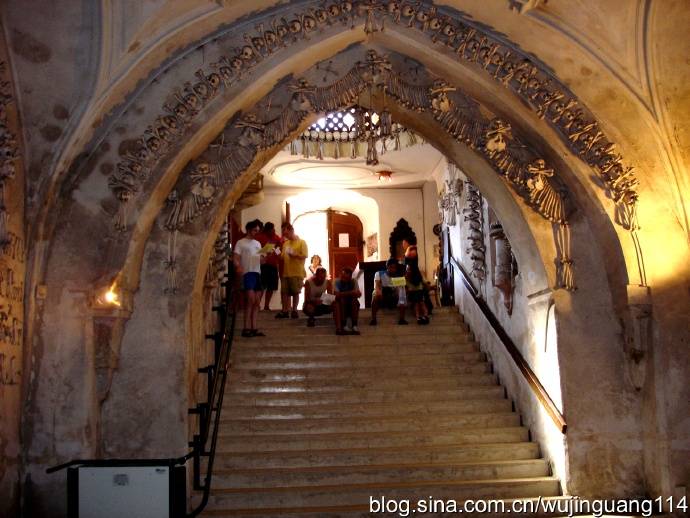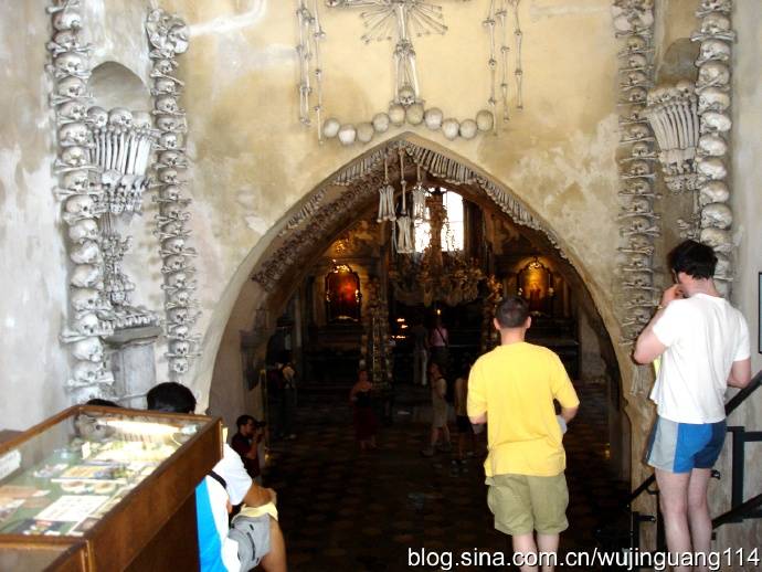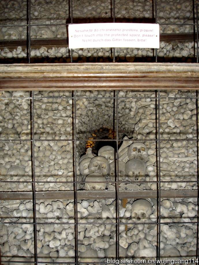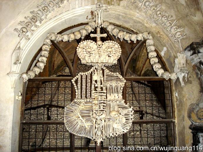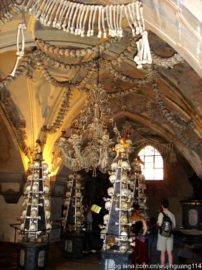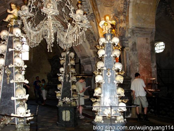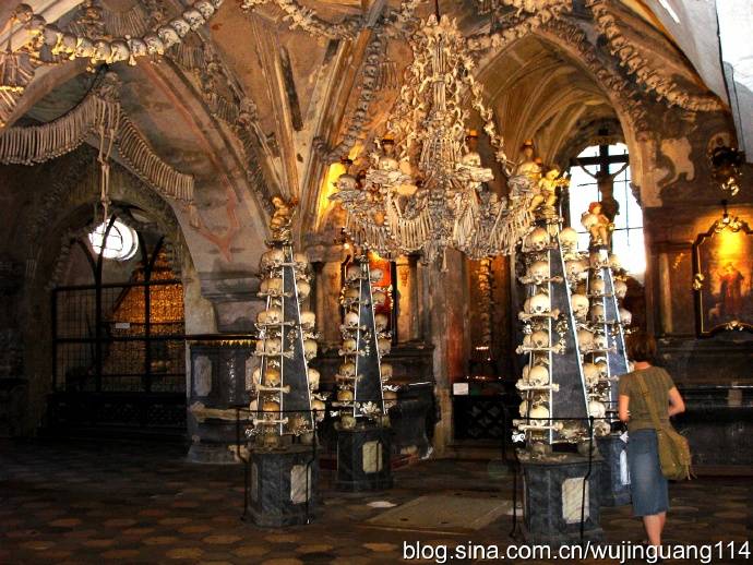 在一个叫库谭胡瓦(Kutna Hora)的小城市旁边有一座用人骨头装饰的教堂,据说,那里本来是一座墓场,但因为死的人太多了,以至于没有地方掩埋了,所以只好放在露天,约4万人,到处都是白骨累累。后来为了纪念和安葬这些可怜的人,就在墓场盖了一座小教堂,请了两个建筑设计师,将这些白骨以艺术的形式装潢在教堂里,这对死去的人也是一种安慰。这座人骨教堂装饰得非常独特,虽然是用累累白骨修饰的,但艺术性极高,使人不会产生望而生畏的感觉。这也是后人用艺术的方法安葬了那些无辜的死难者。