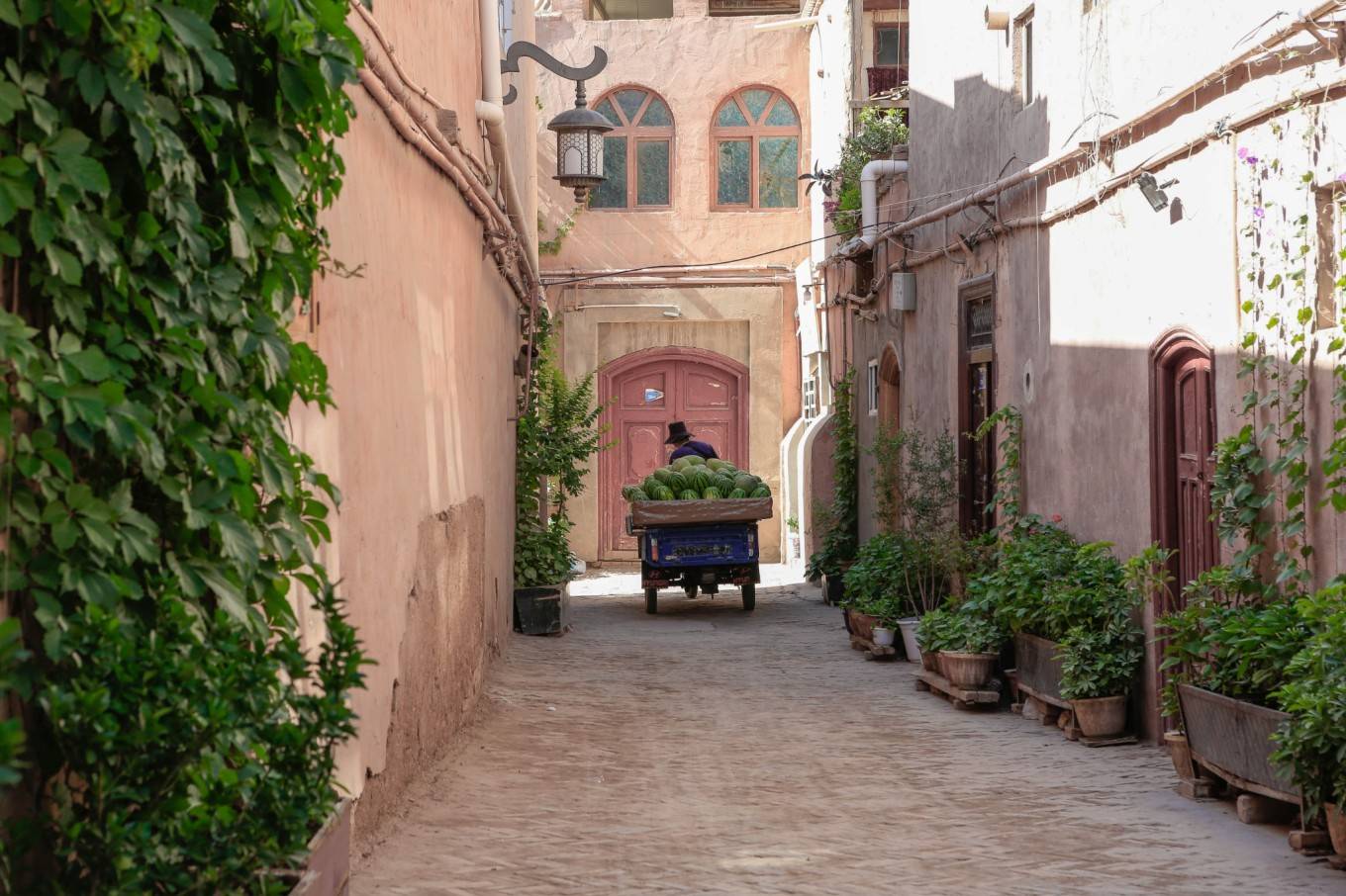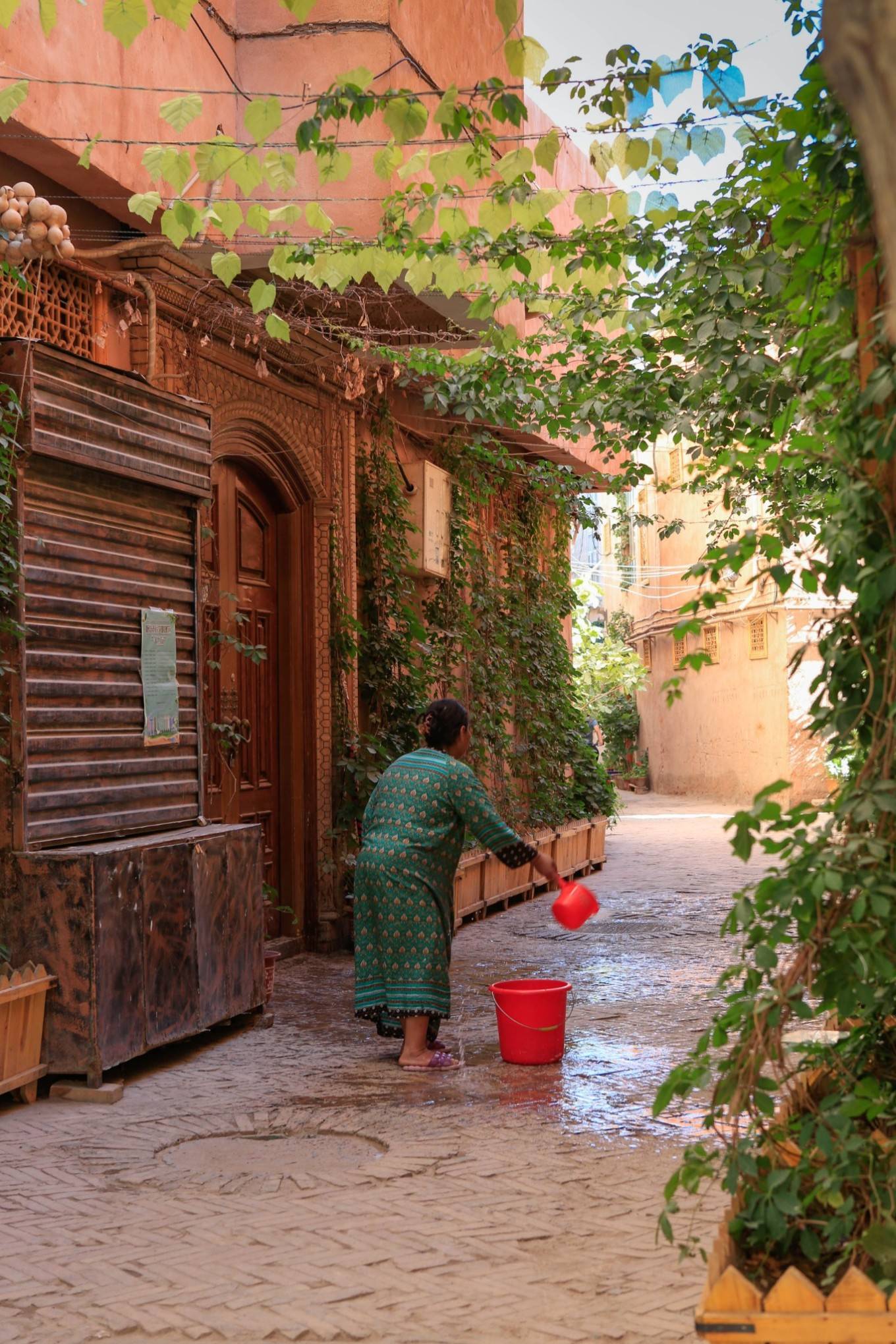 古城内主要道路两旁店铺林立,商业味浓郁。四通八达的小巷子才是精华所在,那是世居于此的维族人的家。家家户户门口都种了花草,每天清晨打扫、浇水是必要工作。