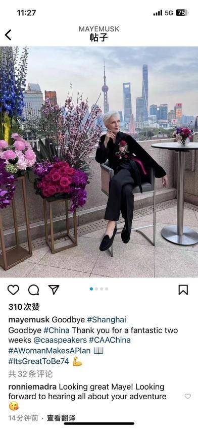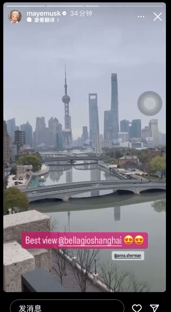 近日,特斯拉创始人埃隆·马斯克先生的母亲梅耶·马斯克女士结束了她为期两周的中国之旅。她此次前往中国宣传新书以及旅行,曾赴广州、成都、苏州、武汉等地,在最后一站上海,梅耶·马斯克女士在其个人社交媒体上晒出了自己与上海地标建筑东方明珠的合照并发布配文,“再见上海,再见中国,谢谢你让我度过了美妙的两周”,而在她发布的视频中她特别提到了“Best view@BellagioShanghai”