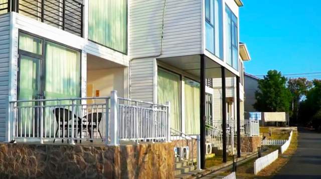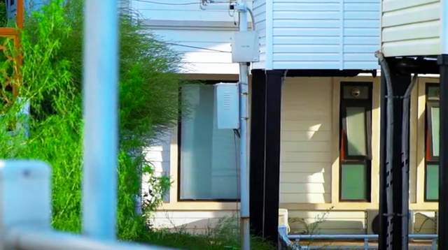 这边有一座民宿建在村里一块小陡坡的巷子旁,独栋楼宇,规模不大。走近观看,民宿的房子建设很有特点,类似经过精心设计装饰的别墅;房子的地基很高,以石块建设,外墙涂抹了水泥,着色不多,粗狂且坚固;从地基往上到第一层,以混凝土的步梯连接,辅助建设了白色金属护栏。上到第一层后,落地窗和房间,分成大厅与客卧,还有全开放的玻璃屋顶。天蓝色窗帘,浅色系墙壁,还有白色金属防盗窗网,看着非常纯净,再摆上遮阳棚,还有绿植与水箱,风格另类。
