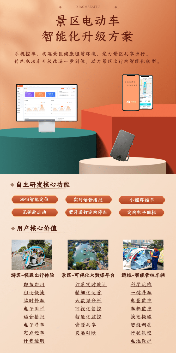 这些智能化功能,正可通过小马在途景区共享平台来实现,小马在途深耕景区电动车共享出行领域,自主研发核心功能,通过智能移动互联网新技术和智能中控终端,助力景区电动车智能化升级,实现景区电动车精细化管理,满足各类景区共享场景。