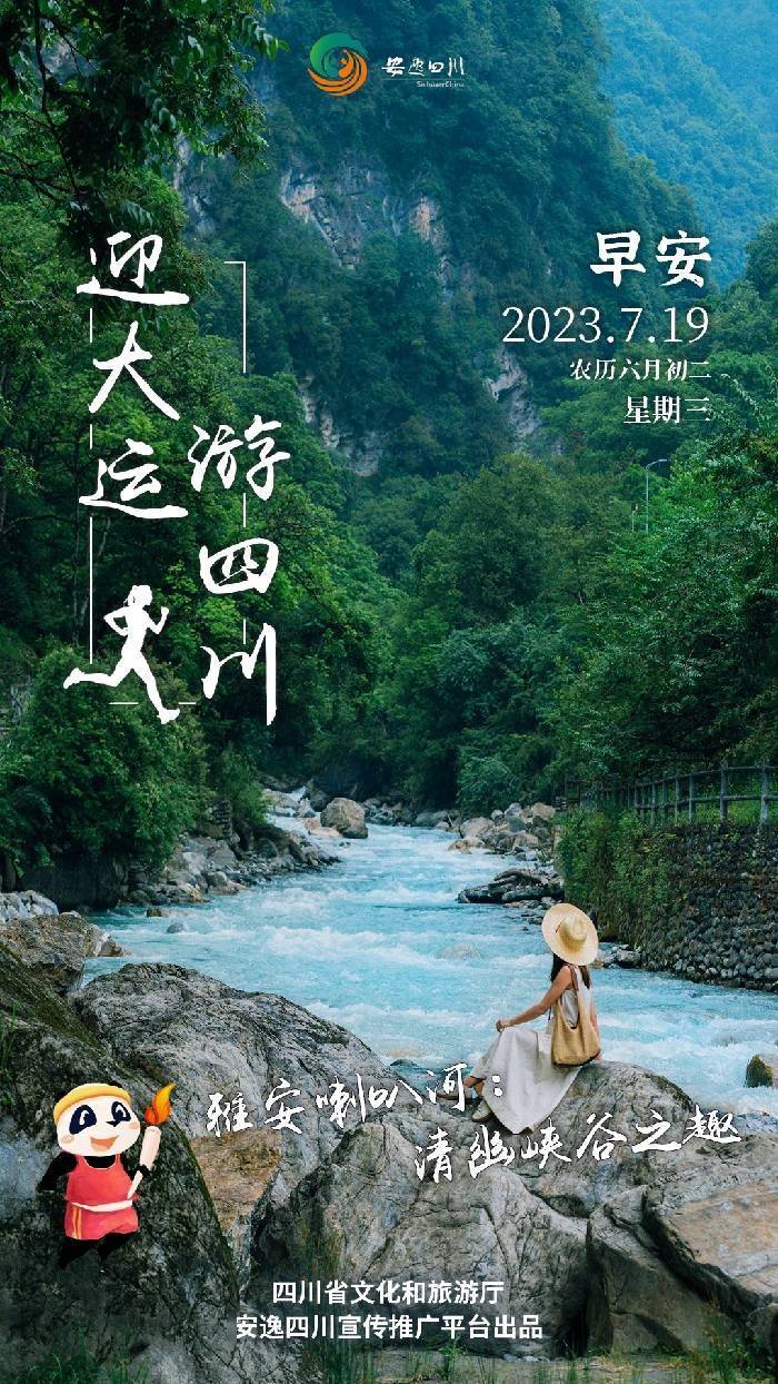 今天安逸四川日历海报“迎大运·游四川”走进喇叭河,享清幽峡谷之趣。