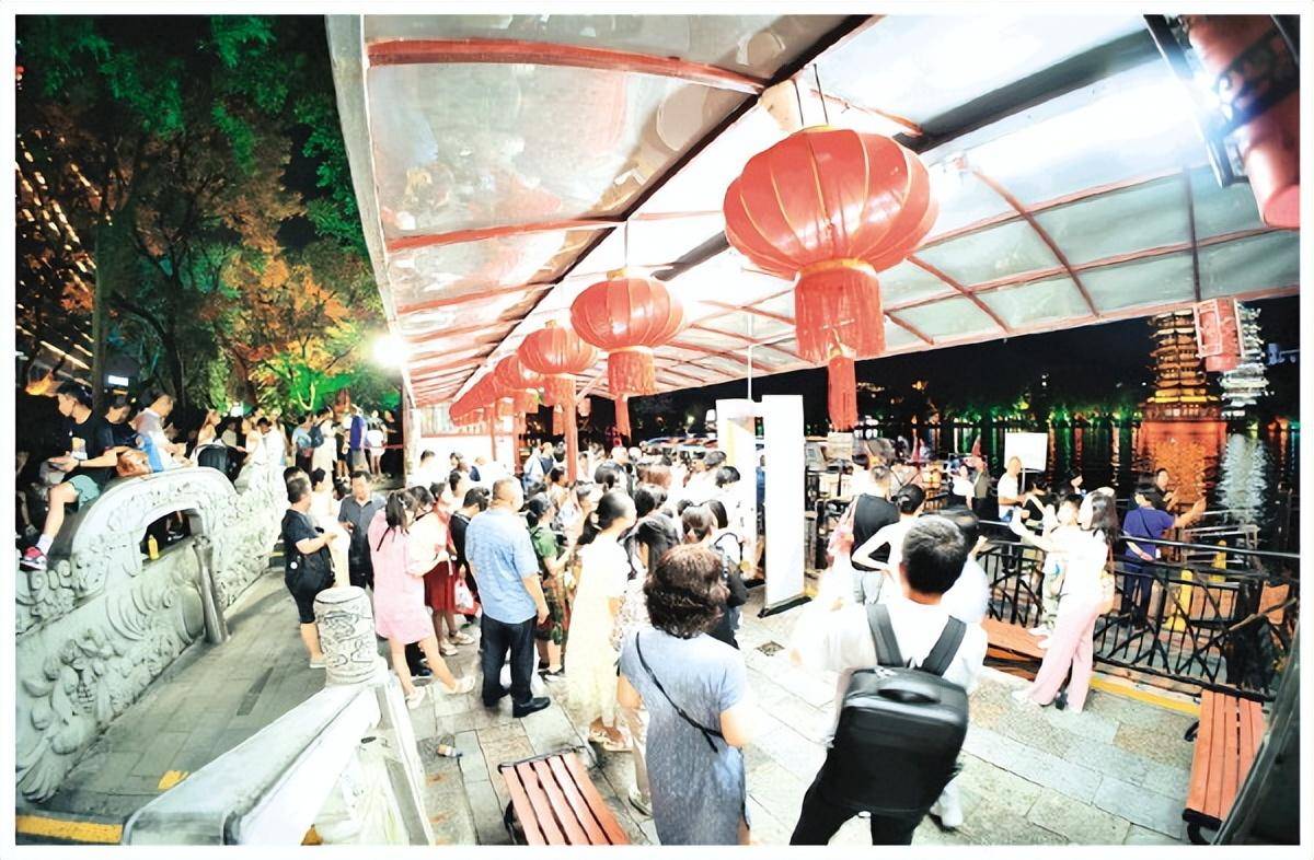 日月湾码头,大批游客在等候乘船夜游“两江四湖”景区。