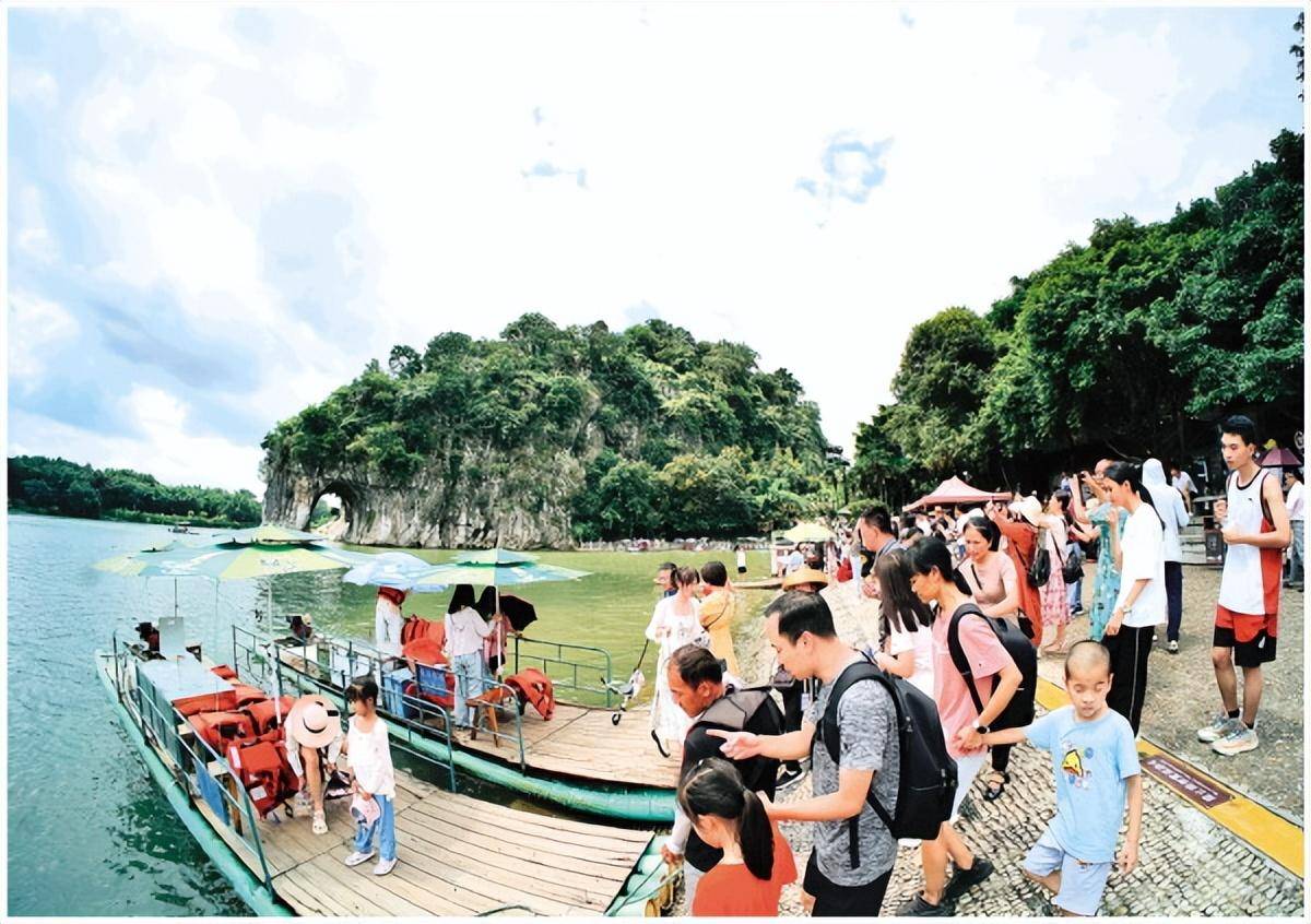 桂林的城徽象鼻山坐落于象山景区公园内。去年春天,象山景区正式对广大游客免费开放,今年旅游复苏的号角吹响,这里无疑成为桂林人气最旺的景点之一。近日,记者来到象山景区附近,只见滨江路上旅游大巴成排停放,景区无论出口、入口都有成群结队的游客。