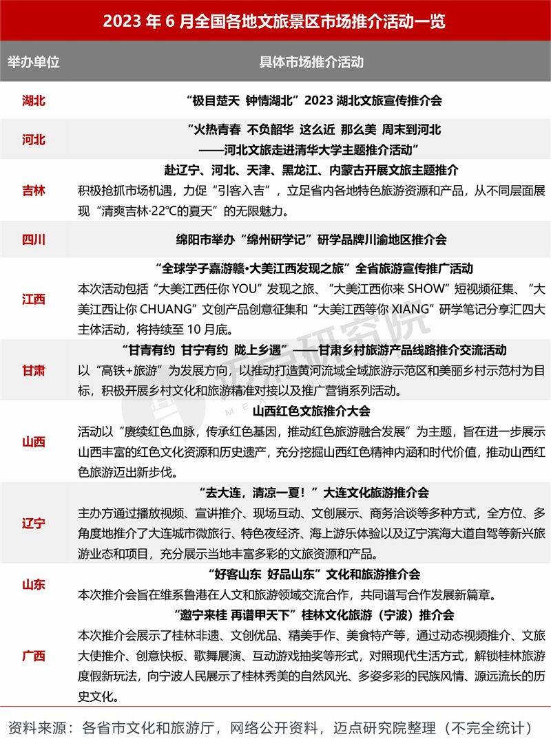 6月正值暑假旅游的预热期,据迈点研究院分析,预期今年7至8月份景区学生客源将会占较大比重,因此各大省市级文旅景区应加大对学生客源的推广力度,如针对客源推出研学、暑期社会实践、亲子游等相关产品,有效吸引消费者的购买欲。如近期,河北省文化和旅游厅、共青团河北省委将宣推工作走进清华校园,在助力大学生暑期实践活动开展的同时,也间接实现了河北人文底蕴的传播,可为各地文旅景区宣推工作提供参考。
