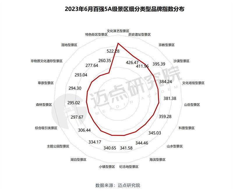 5A级景区百强榜单中,根据类型品牌数量与指数均值分析,现代娱乐类以368.33稳居第二,在品牌打造上占据较大优势,这表明该品类正处于发展阶段,可见未来在扩散上不可限量。根据细分类型品牌指数可见,前10分别为:文化演艺型景区、历史遗址型景区、宗教型景区、沙漠型景区、文化场馆型景区、山岳型景区、科普型景区、山水型景区、海滨型景区、纪念地型景区。