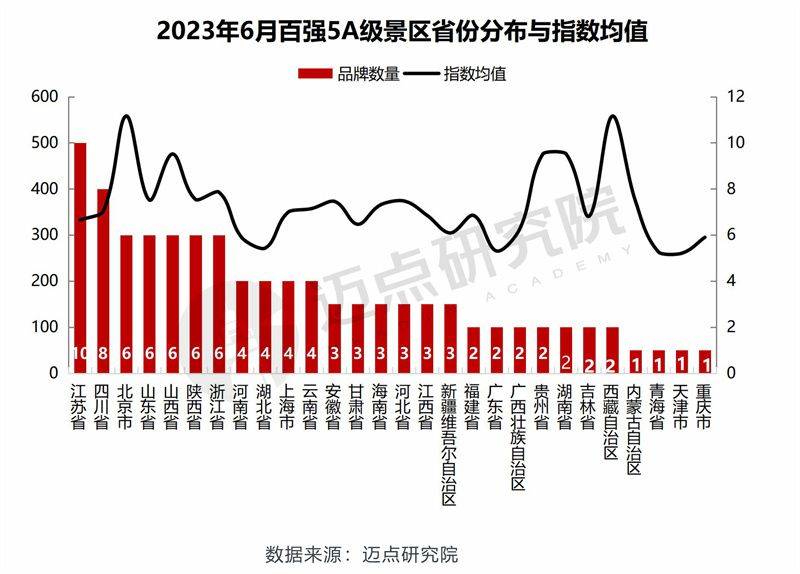 据迈点研究院百强5A级景区区域分布数据显示,华东地区数额明显下降,降至34,华中、华南在数额上均有所增长,表明这两个地区在6月份的品牌打造上优势凸显。从省份角度来看,榜单前十分别为:江苏省(10)、四川省(8)、北京市(6)、山东省(6)、山西省(6)、陕西省(6)、浙江省(6)、河南省(4)、湖北省(4)、上海市(4)。