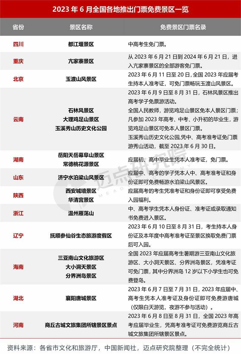 随着中高考的结束,毕业旅行需求得到全面释放,各大省市抓住消费机遇,相继推出针对中高考生的免门票政策,据迈点研究院不完全统计,6月初至8月末,各地均有出示本人为应届考生的相关证明,方可免门票游玩景区的政策。除此之外,为扩大客源流量,湖北、四川、江西等地更是推出大量文旅消费券(补贴),如湖北发放的文旅消费券总值达4亿元。