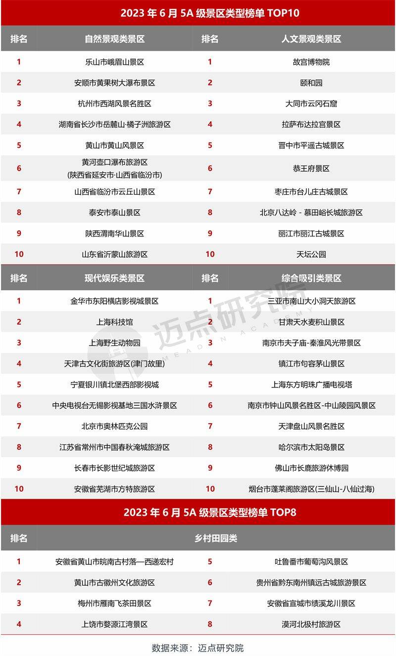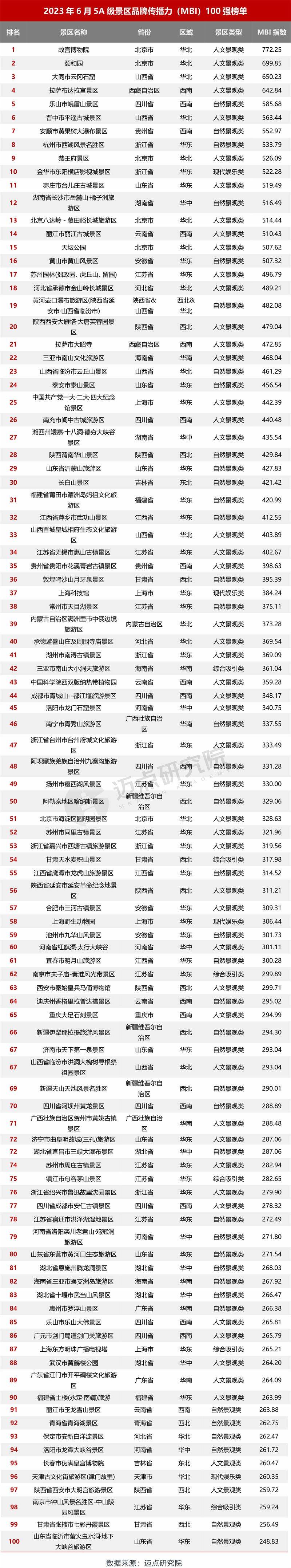 以下是迈点研究院独家发布“2023年6月5A级景区品牌传播力(MBI)100强榜单”。 6月,故宫博物院、颐和园、大同市云冈石窟、拉萨布达拉宫景区、乐山市峨眉山景区、晋中市平遥古城景区、安顺市黄果树大瀑布景区、杭州市西湖风景名胜区、恭王府景区、金华市东阳横店影视城景区跻身榜单前十。