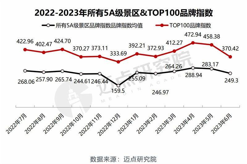 经迈点研究院监测,6月所有5A级景区的平均品牌指数为249.3,环比下降11.96%;100强5A级景区MBI品牌指数均值为370.42,环比下降19.19%。6月整体数值骤减,表明各景区在该月品牌打造上重视程度不够,但随着暑期旅游高峰的出现,迈点研究院相信各景区的品牌高峰数值也将会相继出现。