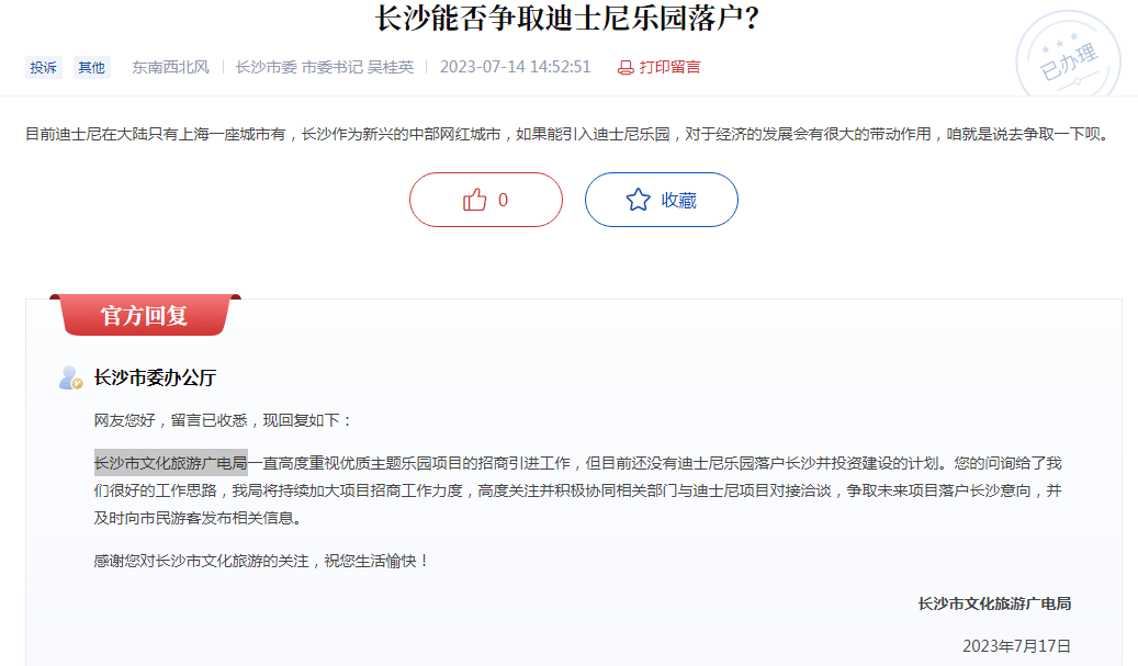 近期,有市民在红网问政留言问到“长沙能否争取迪士尼乐园落户?”。长沙市文化旅游广电局官方回复:“长沙市文化旅游广电局一直高度重视优质主题乐园项目的招商引进工作,但目前还没有迪士尼乐园落户长沙并投资建设的计划。”“您的问询给了我们很好的工作思路,我局将持续加大项目招商工作力度,高度关注并积极协同相关部门与迪士尼项目对接洽谈,争取未来项目落户长沙意向,并及时向市民游客发布相关信息。”