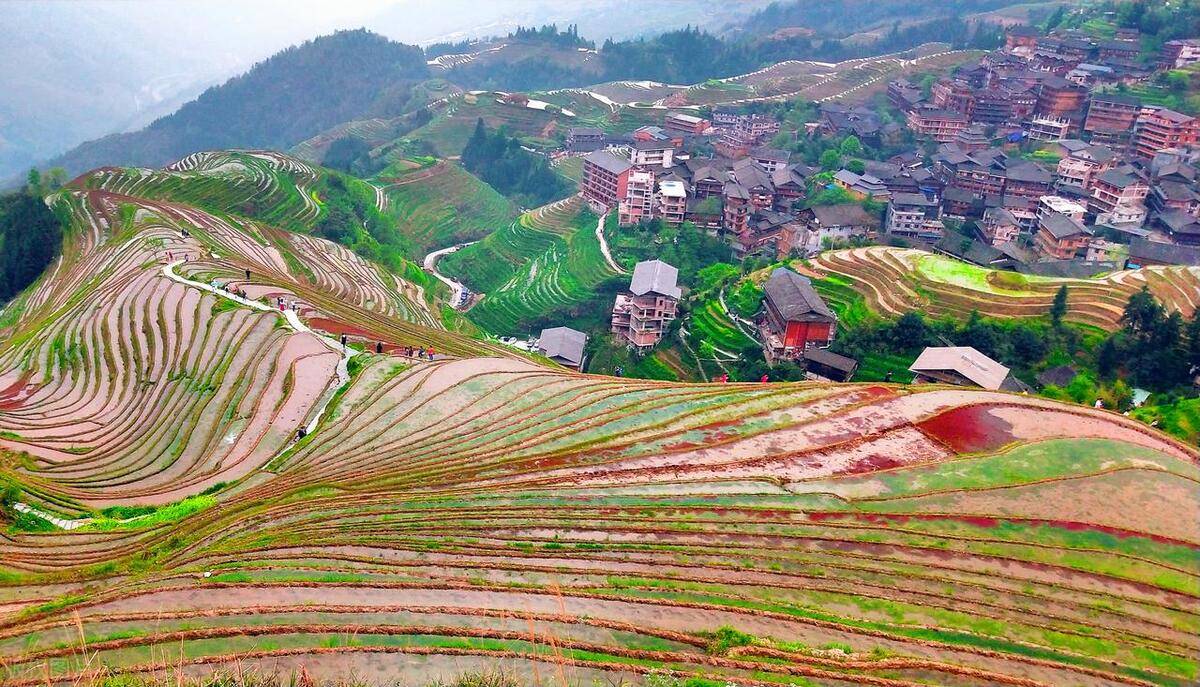 广西桂林龙胜的龙脊梯田被誉为我国古代农耕文明的活化石,有着悠久的耕种历史,是世界人工栽培水稻的发源地之一。2018年,龙脊梯田获得“全球重要农业文化遗产”称号。在山麓下仰望峰峦,层层梯田错落有致,各具风貌又彼此相连,重峦叠嶂的山岭间,蜿蜒的曲线千姿百态、变化万千,宛如一幅宏伟的艺术杰作。山水与田园融合于一体,让人仿佛行走于画中……登临高处俯瞰,横亘的山岭似一条舞动欲飞的巨龙,刚刚灌水、准备插秧的梯田在和煦阳光的映射下,似片片龙鳞闪耀。