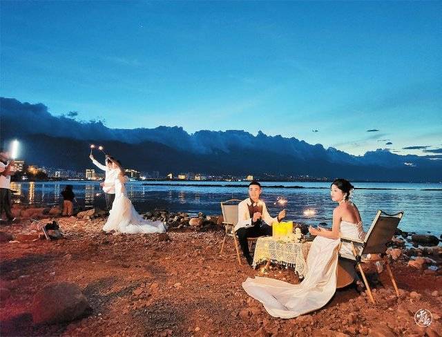 进入夏季,洱海环线随处可见婚纱摄影团队。在龙龛码头、兴盛桥、环海东路、湖滨石滩等非常“出片”的婚拍取景地,海鸥、日出、夜色、烟花等拍摄主题备受青睐。