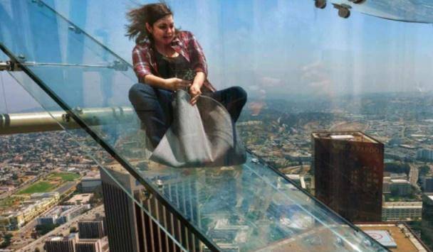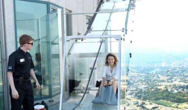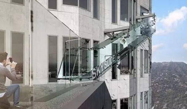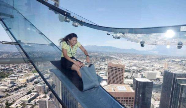它建造在美国当地的一个城市中心里,没有五彩斑斓的颜色,整个滑梯通体采用透明的材质。透明的滑梯并不稀奇,不过它是建造在一个摩天大楼外墙部的第六十九层跟第七十层之间,光是距离地面就有三百多米高。在脑海中想象一下,光是站在七十层的高楼上往下看,都感到害怕极了,更别说要从这个透明的滑梯上滑过去。