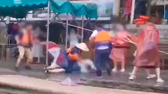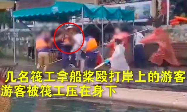 视频中,几名筏工拿船桨殴打岸上的游客,一名筏工甚至拿着船桨疑似打了男游客的头部,随后男游客被其他筏工压在身下。