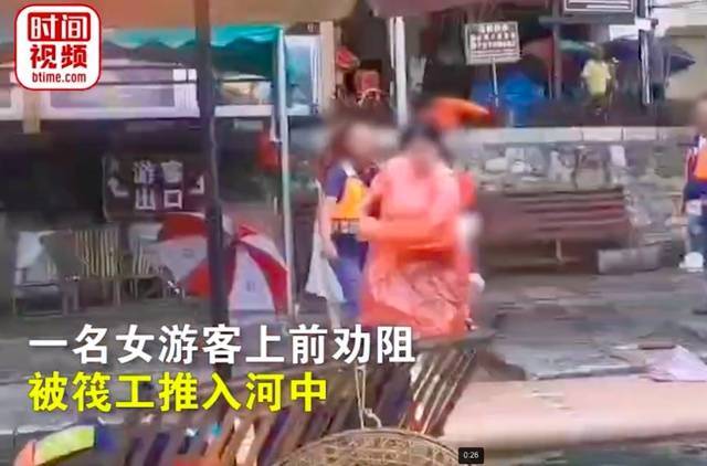 接着,筏工拿起船桨作势要打一名女游客,被他人拦下。被压在身下的男游客还在被另一筏工打,于是女游客上前劝阻,被筏工推下河。