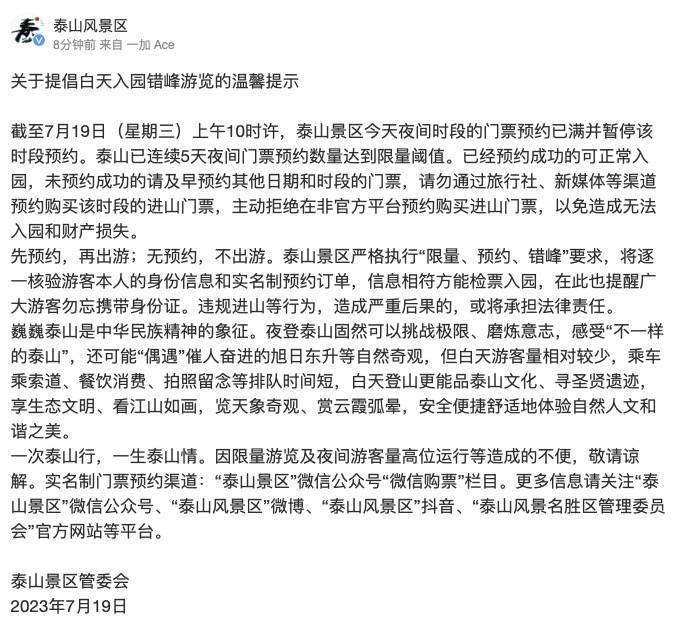 7月19日,泰山景区管委会发布《关于提倡白天入园错峰游览的温馨提示》称,截至7月19日(星期三)上午10时许,泰山景区今天夜间时段的门票预约已满并暂停该时段预约。泰山已连续5天夜间门票预约数量达到限量阈值。已经预约成功的可正常入园,未预约成功的请及早预约其他日期和时段的门票,请勿通过旅行社、新媒体等渠道预约购买该时段的进山门票,主动拒绝在非官方平台预约购买进山门票,以免造成无法入园和财产损失。