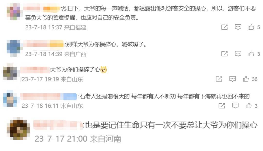 拍摄者黄女士介绍,当天去石老人海水浴场游玩,现场看到安保大爷在喊话,提醒游客不要去深水区,并且一直在循环喊话提示,觉得很感动。黄女士表示,安保大爷一天到晚都要工作,非常辛苦。