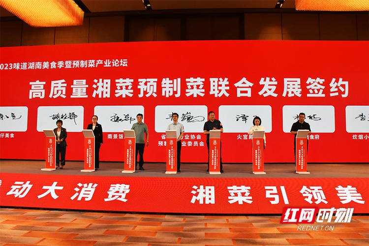 活动现场,湖南省商务服务中心与中国烹饪协会、美团、抖音、红网共同签订了“味道湖南”战略框架协议。湖南省餐饮行业协会预制菜专业委员会与火宫殿、冰火楼、秦皇食府、南景饭店、炊烟小炒黄牛肉、童仔美食6家湖南餐饮企业代表签订“高质量湘菜预制菜联合发展”合作协议。湖南新聪厨食品有限公司、湖南巧佳宴食品有限公司、湖南彭记坊农业科技发展有限公司、湖南聚味堂食品有限公司、湖南宇成食品有限公司、湖南掌中勺食品有限公司6家预制菜龙头企业,与浏阳市小河聪厨蔬菜加工厂、华容县云芳蔬菜有限公司、湖南十八子农产品有限公司、衡东富盈种植专业合作社、湖南插旗菜业有限公司、天祝藏族自治县家家乐种植家庭农场6家农产品食材基地进行项目签约。