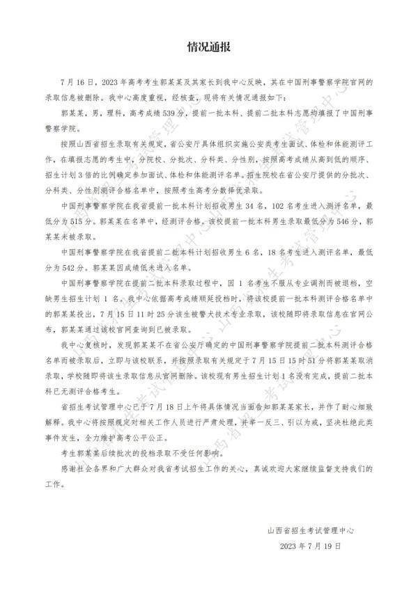 记者注意到,2023年7月19日,山西省招生考试管理中心发布情况通报。