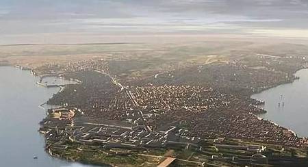在小亚细亚的对岸,马尔马拉海的西岸,皇帝君士坦丁一世将新都选址在曾被塞维鲁皇帝摧毁的希腊古城拜占庭的遗迹上。皇帝借着“基督教的托梦”将首都定在了这里。新城市南邻马尔马拉海,将东西两翼的博斯普鲁斯海峡和马尔马拉海峡牢牢锁住,内侧的金角湾成为了天然的良港和控扼的贸易据点。