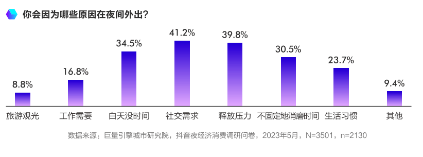 巨量引擎发布的《2023年中国城市夜间经济发展报告》亦指出,通过调研发现用户选择在夜间外出越来越趋向于主动选择,而非被动接受;相对于工作需要、白天没有时间不得不选择夜出的人群,越来越多人会因社交需求、释放压力、消磨时间的原因,主动选择在夜晚外出或消费,甚至已有超20%的用户表示养成了夜间外出的生活习惯,夜生活不再是生活方式的备选。