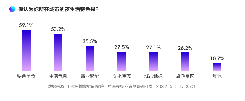 此外,限时步行街的火爆,也源于其精准切中了城市夜生活的业态需求。巨量引擎调研显示,对于夜生活特色,餐饮和生活气息是居民最“易感”且认知度较高的类目。主打网红美食和烟火气的限时步行街也由此更易成功。
