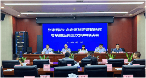 为进一步优化旅游营商环境,深入推进“铁腕治旅”行动,7月18日下午,张家界市委网信办牵头,联合市公安局网技支队、永定区委网信办、市文化行政执法支队永定大队和永定区市场监督管理局,对23名平台主播及相关旅行社负责人就旅游营销违法违规行为进行了集中约谈。