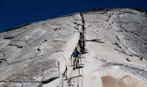 第四个是约塞米蒂半圆顶。在约塞米蒂的半圆顶上有一些阶梯,阶梯又细又长令人心生胆怯,由于道路阶梯位于山间,坡度较陡,间隔相对比较大,所以非常难走,一不小心就因为脚没踩稳而跌落下去。虽然攀登如此艰难,但是到此来攀爬寻求刺激的人们也络绎不绝,吸纳了大量的游客,由此不禁对修路人升起了钦佩之情。