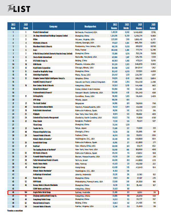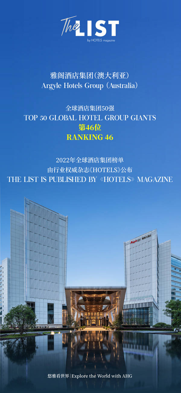 近日,酒店行业国际权威杂志《HOTELS》发布了2022年度“全球酒店集团225强”榜单(HOTELS 225)最新排名。雅阁酒店集团(澳大利亚)进入全球酒店集团50强,位居全球榜单第46名,作为榜单TOP50高端酒店集团层中,是唯一的来自澳大利亚的国际酒店管理集团。