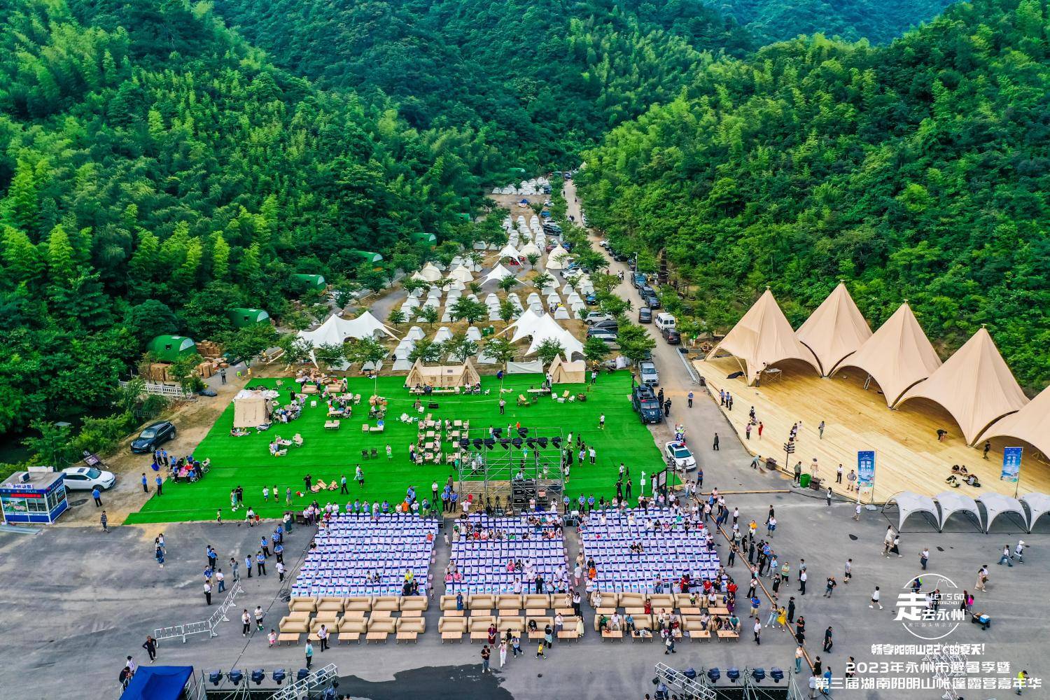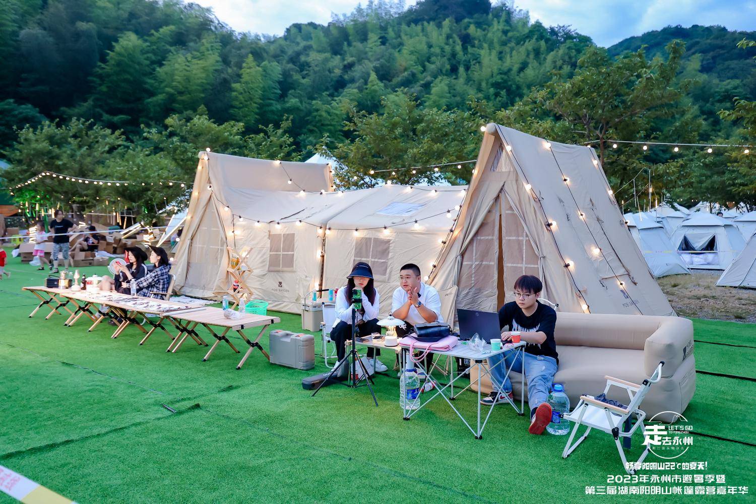 每逢盛夏,阳明山上大小宾馆、农家乐等的房间,纷纷被提前预订,可谓是一房难求。为应对这一情况,草地为台,山湖为幕,帐篷为营,阳明山上的万和湖露营基地顺势而生。7月14日晚,2023年永州市避暑季暨第三届湖南阳明山帐篷露营嘉年华在这里开幕。在近3个月的活动期间,会陆续推出《我们的音乐会》、2023湖南“舞动潇湘”广场舞大赛、“运动一夏,暑你最棒”亲子嘉年华等十二大主题活动,打造“帐篷+音乐+美食+运动+亲子”模式,给游客打造一场沉浸式避暑露营体验。