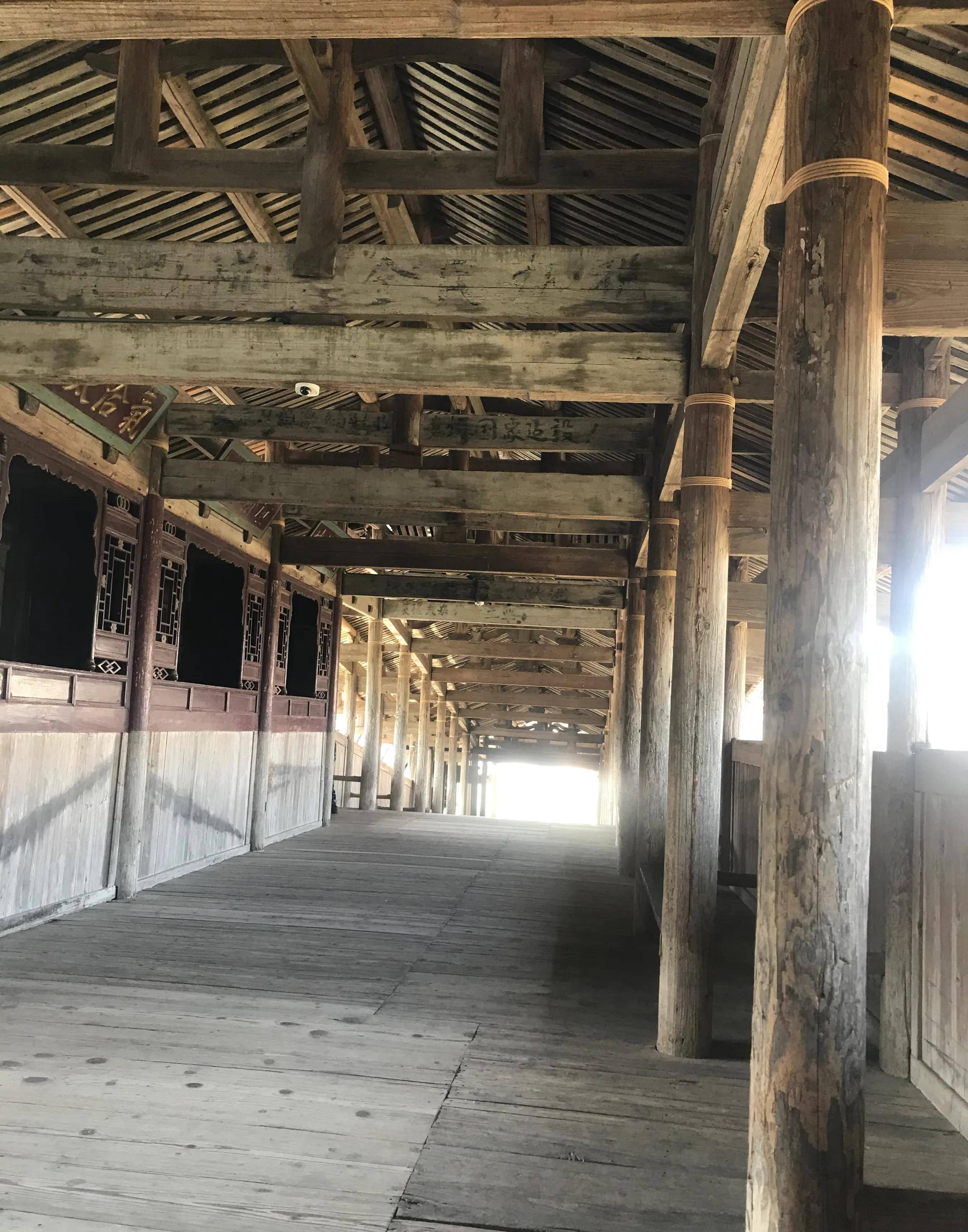 泰顺北涧廊桥(简称泰顺廊桥)三角形木拱,“钩心斗角”鲁班祖师爷工艺,精巧,没有一根铁钉。工艺完胜!