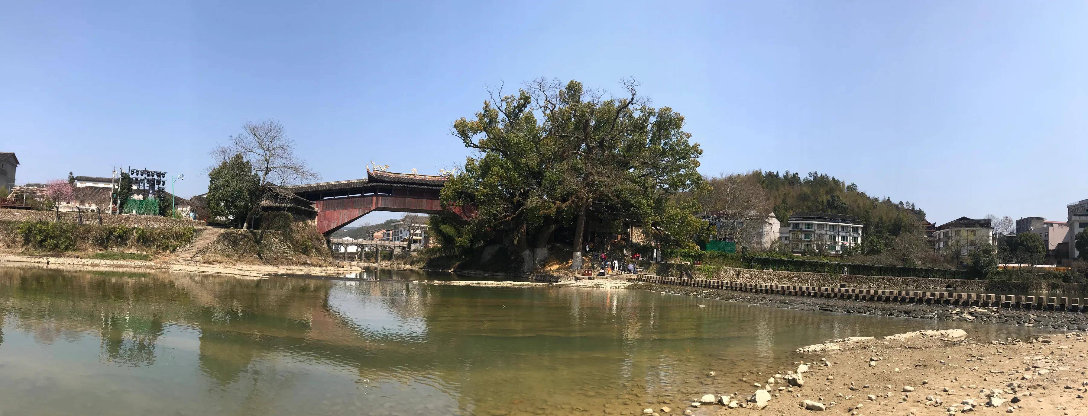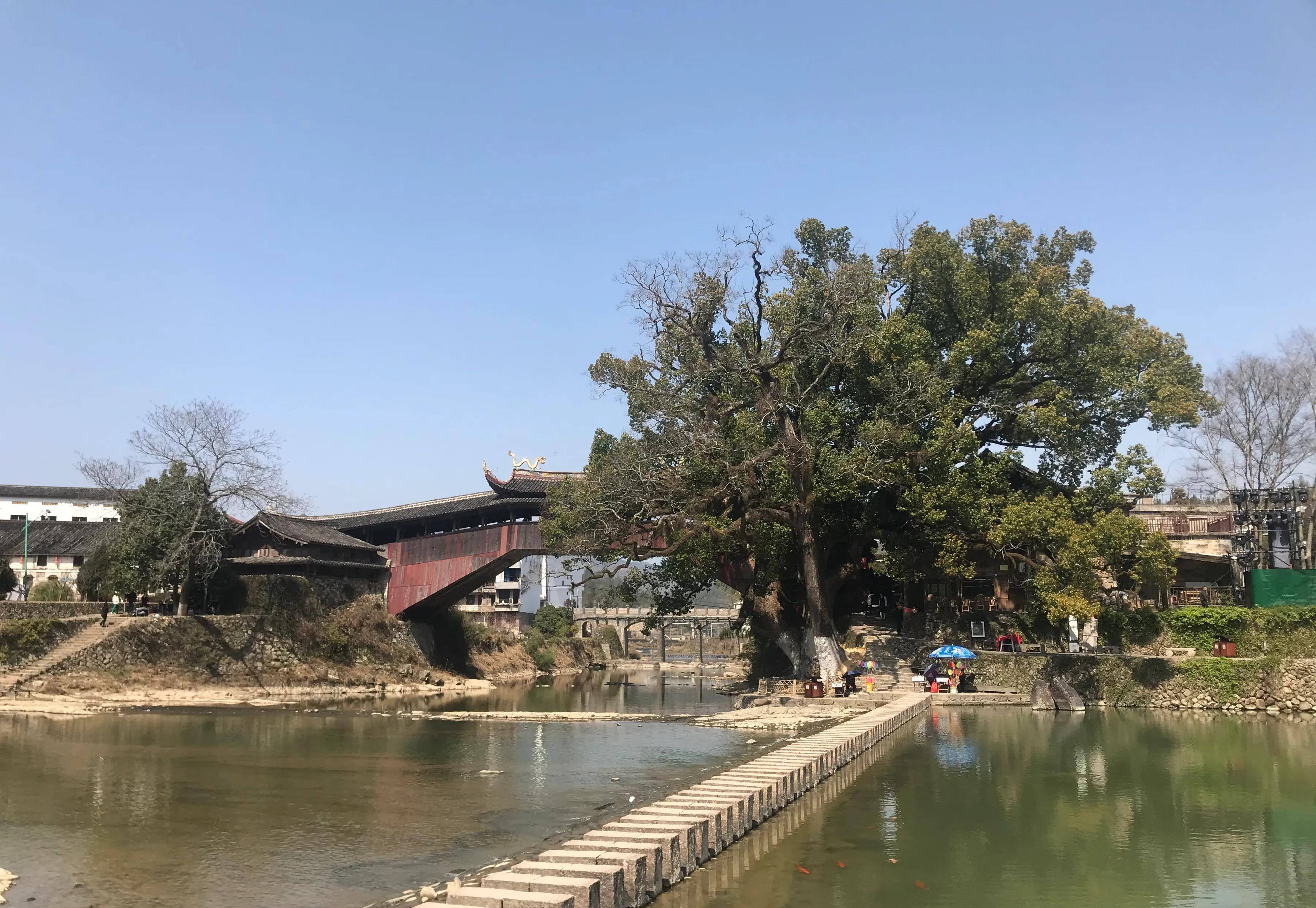 然而,泰顺廊桥,有更古老的爱情神话传奇:彩虹桥头,有两株参天大树,樟树与乌桕树,树龄都超过1000岁。樟树硕壮,目测树围有10米或者更多,枝叶茂盛、遮天蔽日、生机勃勃,一年四季常绿。相拥近前古乌桕树,树围也约两抱,树干笔立齐天,春发、秋红、冬落叶。与樟树心心相印,不离不弃,尤其春季叶红时节,女人魅力更是彰显无遗。可以这样想像,如果说北京西山红枫是沉醉妖艳,那么长江三峡红叶是廊廓绚烂,其三峡红叶主体正是乌桕树。千年来,樟树乌桕相依相偎,百姓称其“夫妻树”。老树成精即神话,“我们结婚吧,泰顺廊桥夫妻树下”。神话完胜!