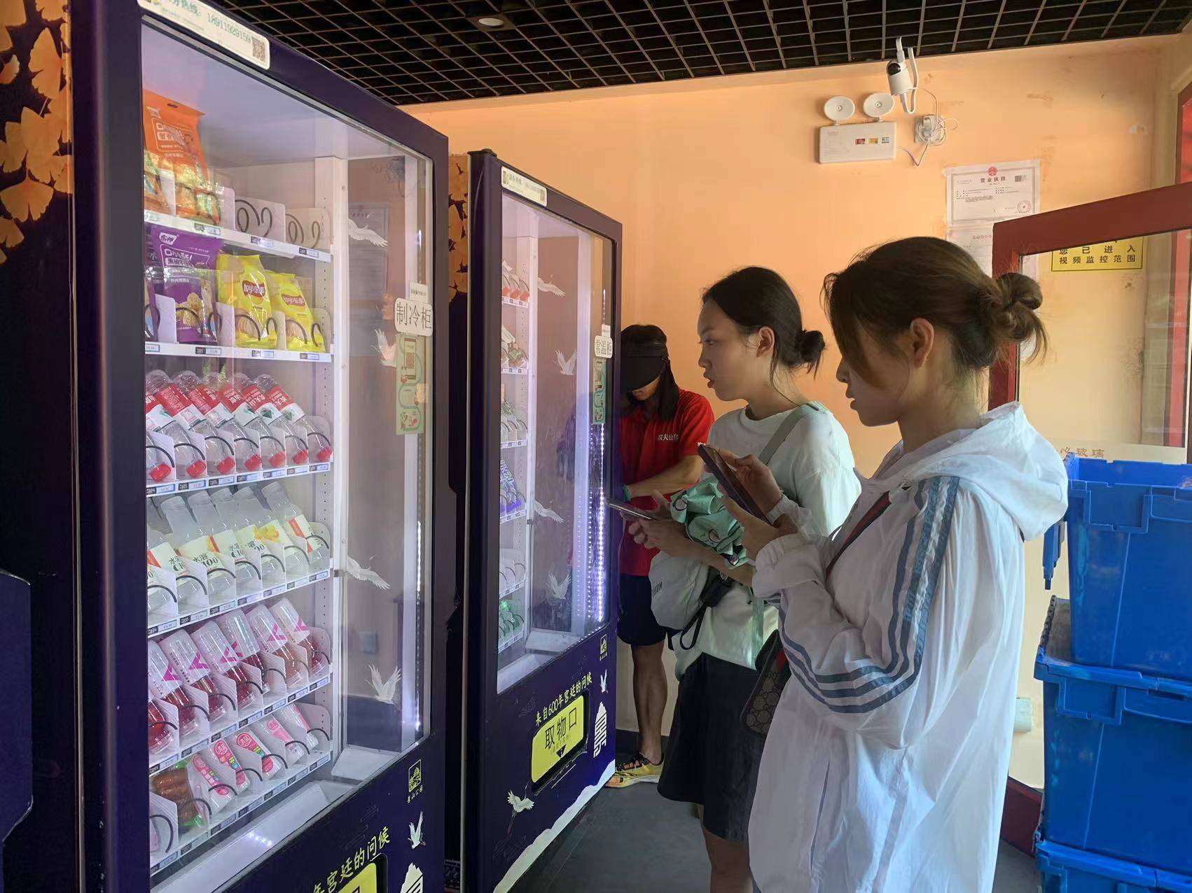 公园里的自助服务商店里,游客们正在自助购买各类饮品、食品,自助机分常温柜和制冷柜,方便游客按需选购。工作人员霍建生和同事正在进行上午的第二次补货。他说: