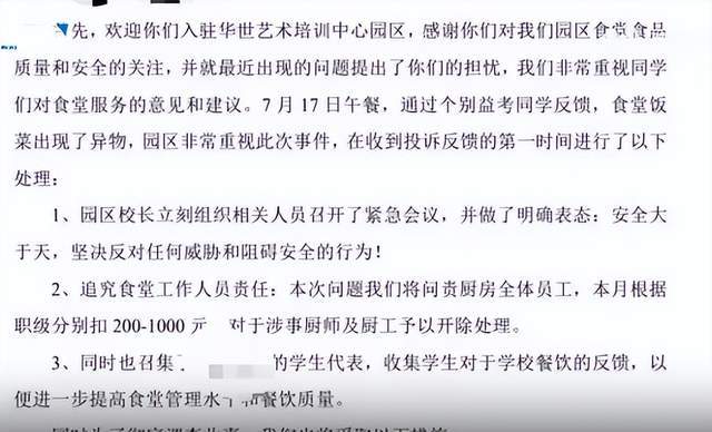 事后,校方回复称,已经问责食堂全体工作人员,并进行了罚款,同时开除了当天负责做饭的厨师,成立了专门的调查小组对异物进行调查。