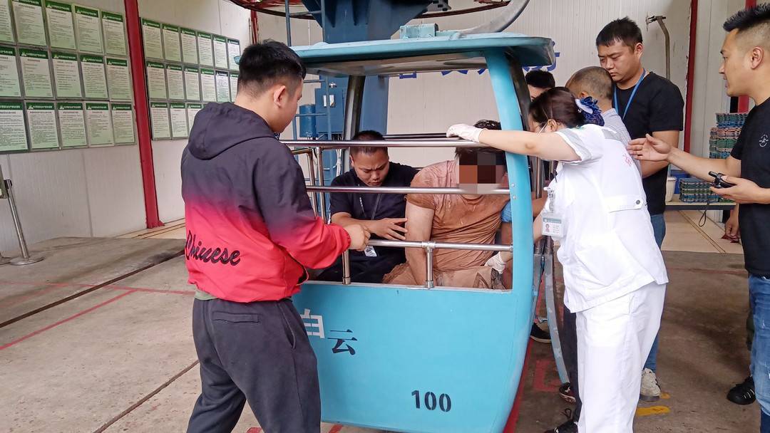 此时,该名游客正躺在泥泞的小路一侧,无法动弹。经过医护人员的现场检查,初步判断该名游客伤情较重,需马上转运下山抢救。但如何能快速又安全的转运受伤游客成了摆在吴君如等人面前的一道难题。