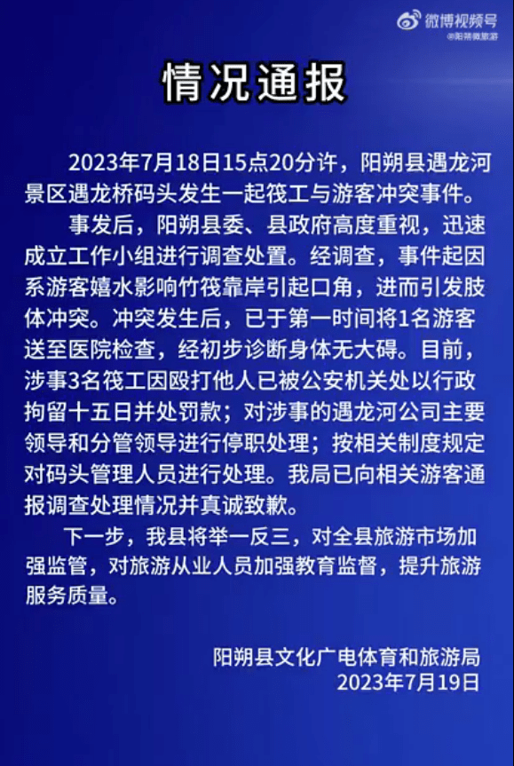 事发后,阳朔县委、县政府高度重视,迅速成立工作小组进行调查处置。经调查,事件起因系游客嬉水影响竹筏靠岸引起口角,进而引发肢体冲突。冲突发生后,已于第一时间将1名游客送至医院检查,经初步诊断身体无大碍。目前,涉事3名筏工因殴打他人已被公安机关处以行政拘留十五日并处罚款:对涉事的遇龙河公司主要领导和分管领导进行停职处理;按相关制度规定对码头管理人员进行处理。我局已向相关游客通报调查处理情况并真诚致歉。