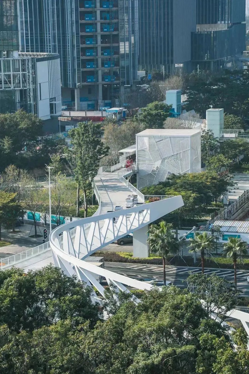 滨海廊桥包括了12处景观节点、9大特色区段、8种植物主题、8个下沉广场、6段特色地下街道,宛若一道“彩链”从宝安中心区上方划过,筑造出华丽城市天际线。