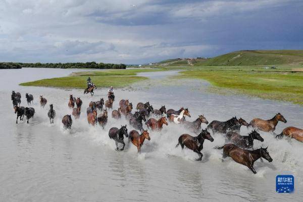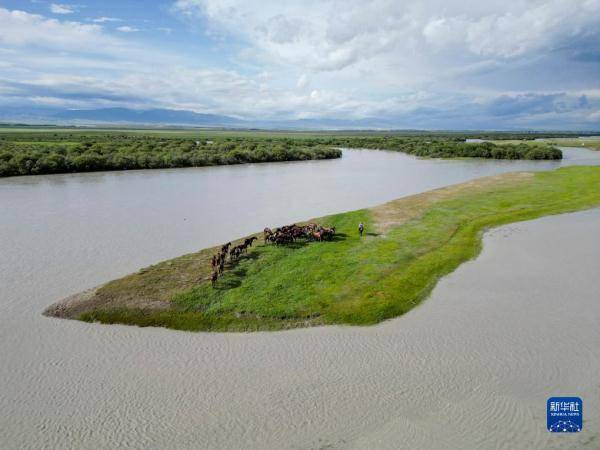 这是7月17日在新疆伊犁哈萨克自治州昭苏县湿地公园景区拍摄的“天马浴河”景观(无人机照片)。