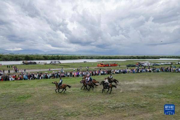 游客在新疆伊犁哈萨克自治州昭苏县湿地公园景区观看民俗表演(7月17日摄,无人机照片)。