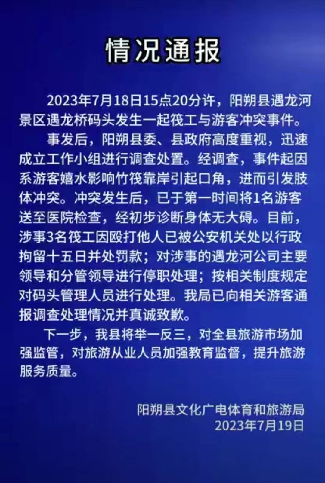 目前,涉事3名筏工因殴打他人已被公安机关处以行政拘留十五日并处罚款;对涉事的遇龙河公司主要领导和分管领导进行停职处理;按相关制度规定对码头管理人员进行处理。我局已向相关游客通报调查处理情况,并真诚致歉。