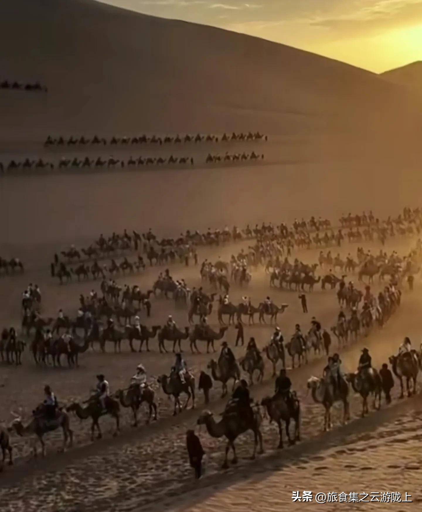 在敦煌,壮观的骆驼队伍斗折蛇行、蜿蜒绵亘,仿佛古代东进朝贡的使团,威武雄壮。