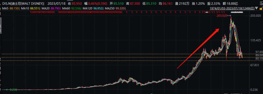 不过2009年触底后,迪士尼又再次启动,股价一直涨到2021年,接近15倍。