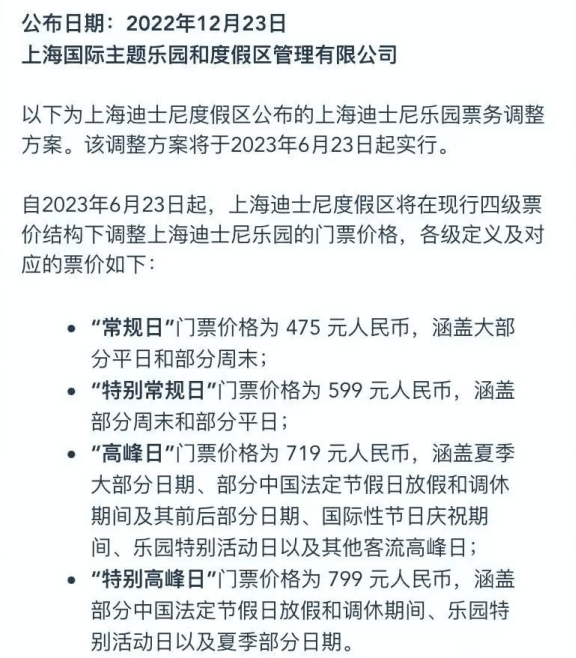 根据上海迪士尼官网显示,自6月23日起,常规日票价由435元上调至475元,各时段都有一定幅度,特别高峰日门票更是直冲799元。从2016年开业以来,已经是第四次涨价。之前多次涨价依旧热度不减,2021年,“达菲和朋友们”圣诞玩偶系列的发售日,凌晨三点的迪士尼门口就有超过5000人排队。