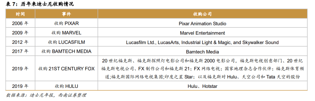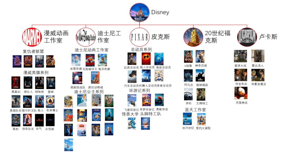 2006年,迪士尼收购皮克斯动画工作室,2009 年收购漫威,2012 年收购卢卡斯,2019 年收购 21 世纪福克斯,相继推出《星球大战》、《蚁人》、《大黄蜂》、《复联 3》等票房佳作。全球影史票房前20名,有超过一半都是迪士尼的电影。