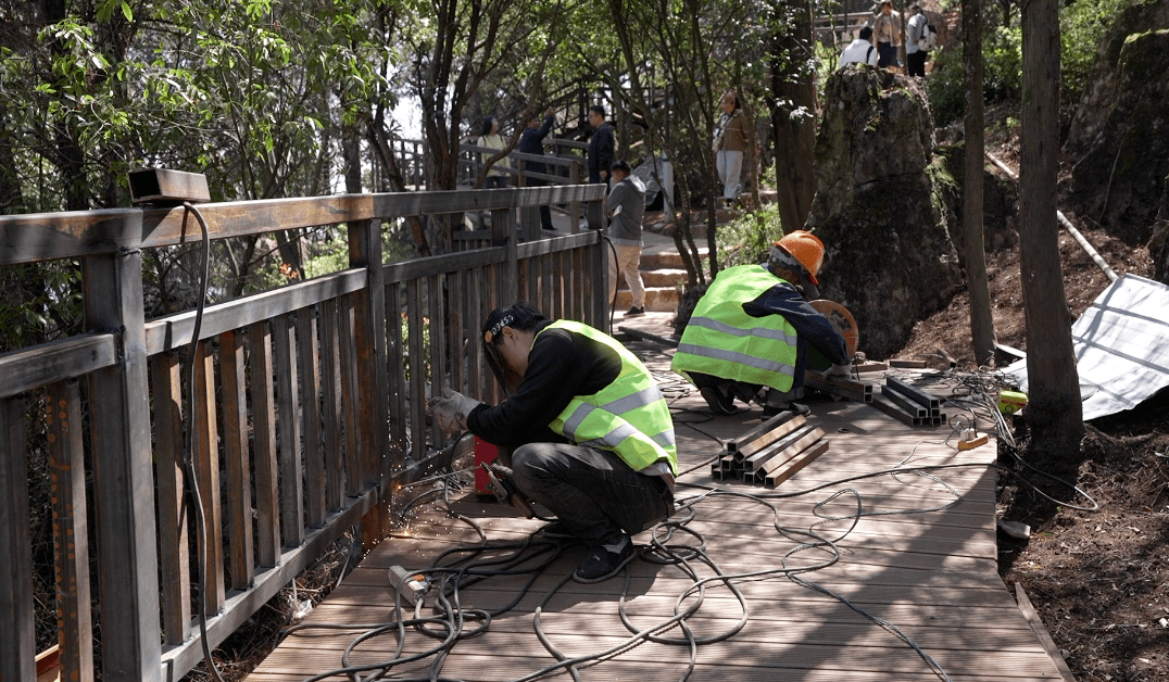 记者在现场看到,人行步道上损坏的地板、有隐患的围栏都重新进行了加固;建设未完成的区域,都用障碍物进行了围挡;对步行栈道也进行了维修。